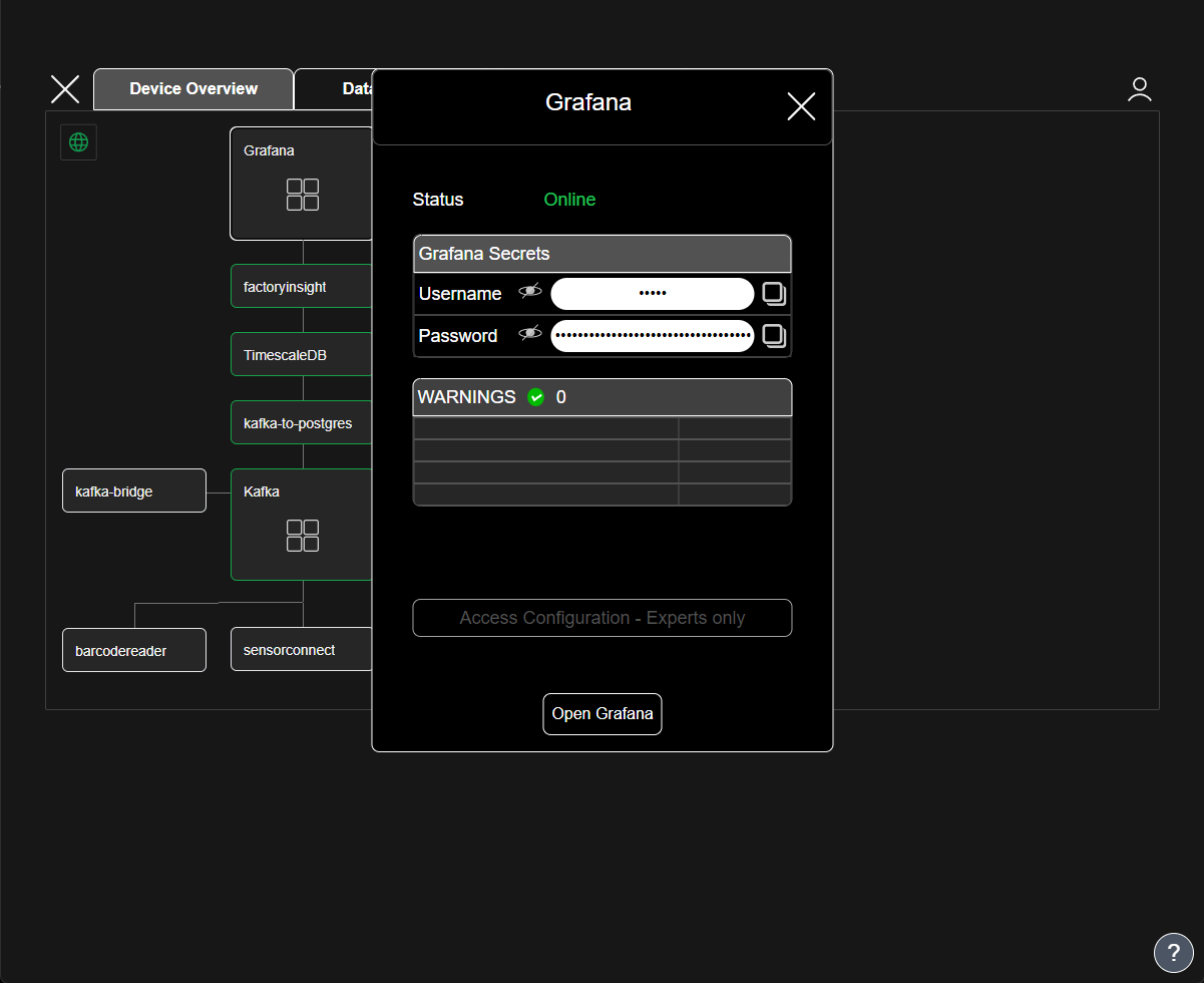 - Close the Node-RED popup and click on the Grafana service. Some popups, like this one, give additional information like the Username and Password to log in to the Grafana Web interface.