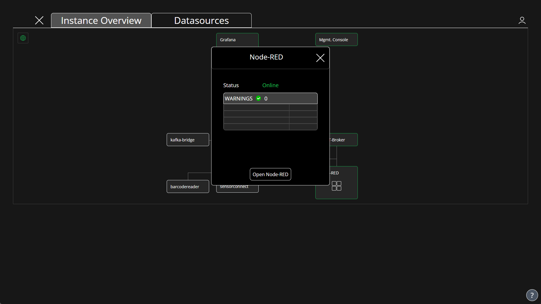 - Click on Node-RED to open the service popup. In the popups, you can see the status of the current service as well as warnings. To access the web interface of the service, if it features one, click on the Open button.